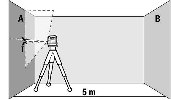 精度チェックを行うには、壁面(AおよびB)にはさまれた干渉物のない測定距離(5 m)と安定した設置面が必要になります。