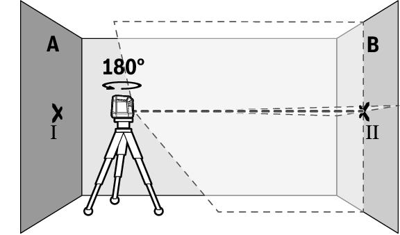 - 本機を180°回転させてから整準させ、反対側の壁Bのレーザーラインの交点に印を付けます(ポイントⅡ)。