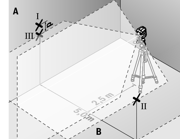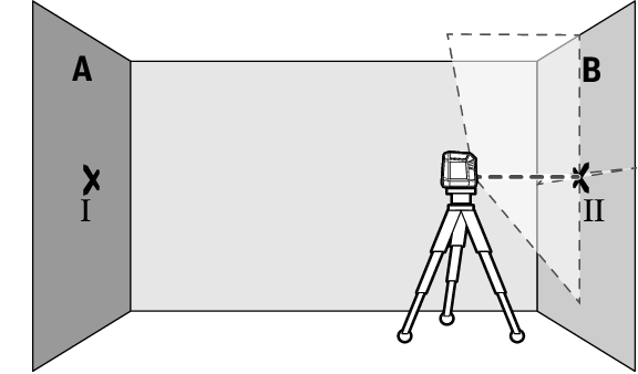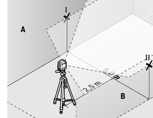 - 本機から2.5m離れた、両側の壁のレーザーラインの中央に印を付けます(壁AのポイントⅠと壁BのポイントⅡ)。