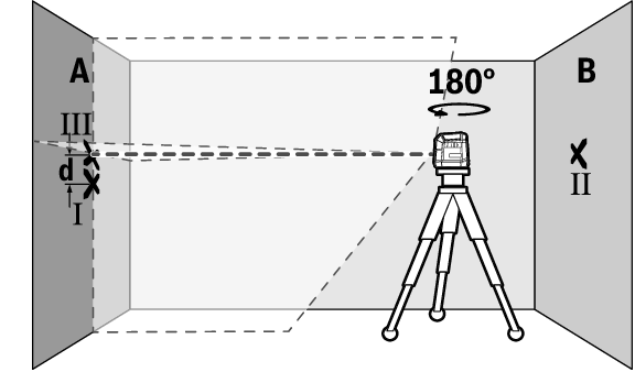 - 高さが変わらないようにして本機を180°回転させます。垂直のレーザーラインがすでに印を付けたポイントⅠに来るように、本機を壁Aに向けます。本機を整準させ、壁Aのレーザーラインの交点に印を付けます(ポイントⅢ)。