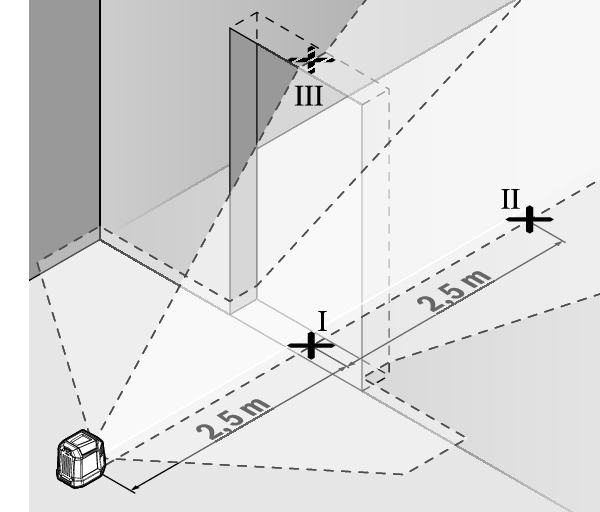 - ドア開口部の床(ポイントⅠ)、ドア開口部の反対側の5m離れた箇所(ポイントⅡ)、そしてドア開口部の上端(ポイントⅢ)の垂直レーザーラインの中央に印を付けます。