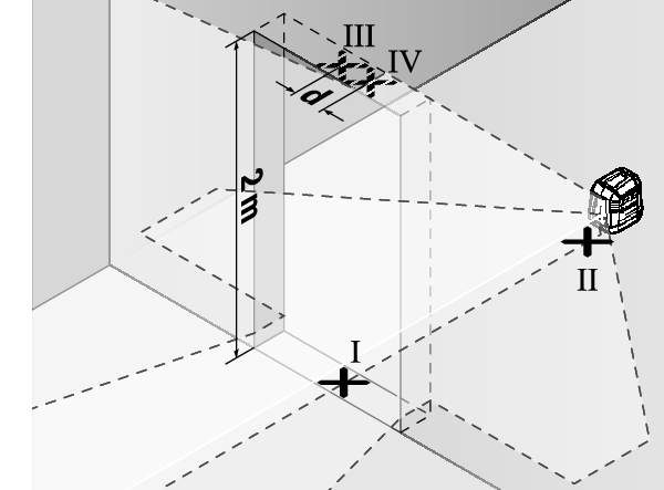 - ポイントⅡのすぐ後ろのドア開口部の反対側に本機を設置します。本機を整準させ、垂直レーザーラインの中心がポイントIとIIを通るようにします。